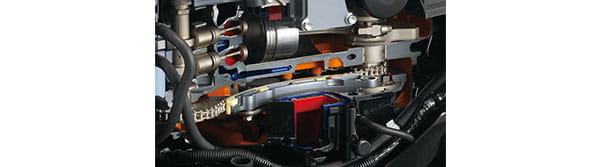 Suzuki's self-adjusting timing chain is featured on the DF60A which is the first outboard in the 44.1kW (60PS) class equipped with this maintenance free feature. The chain is oil-bathed and features an automatic hydraulic tensioner that keeps the chain properly adjusted at all times for maintenance free operation.
